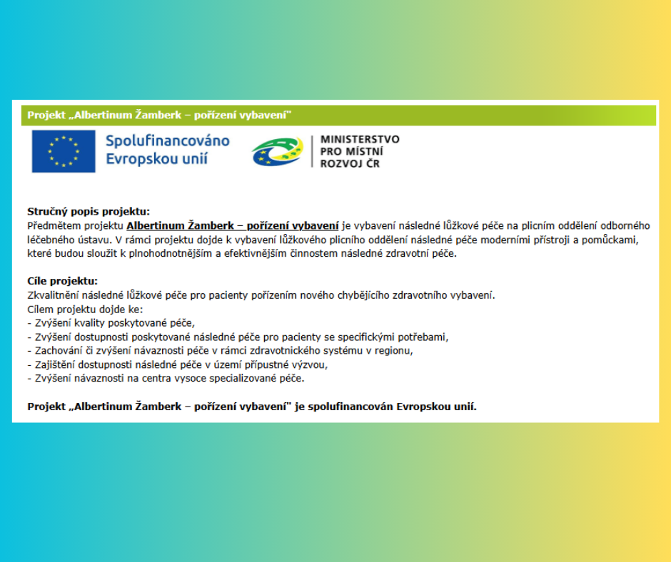 Předmětem projektu Albertinum Žamberk – pořízení vybavení je vybavení následné lůžkové péče na plicním oddělení odborného léčebného ústavu. V rámci projektu dojde k vybavení lůžkového plicního oddělení následné péče moderními přístroji a pomůckami, které budou sloužit k plnohodnotnějším a efektivnějším činnostem následné zdravotní péče.
